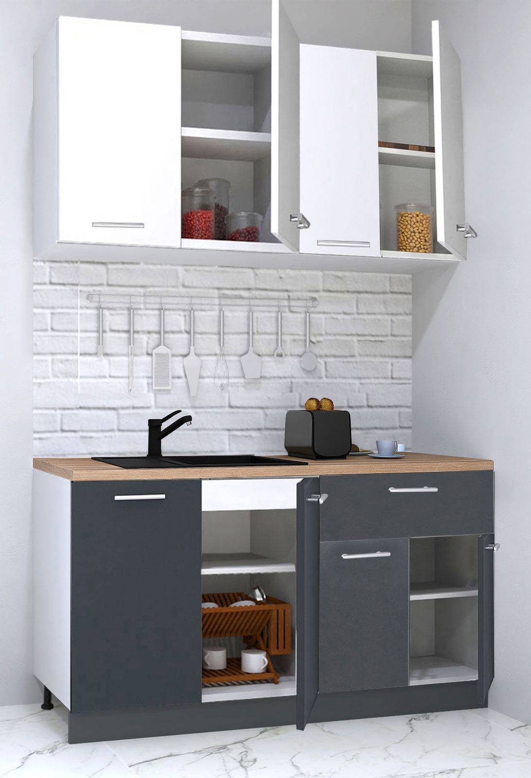 Setul este livrat impreuna cu blatul de lucru inclus in pret, realizat in finisaj Sonoma, cu o grosime de 25 mm, ce confera rezistenta si un aspect modern.