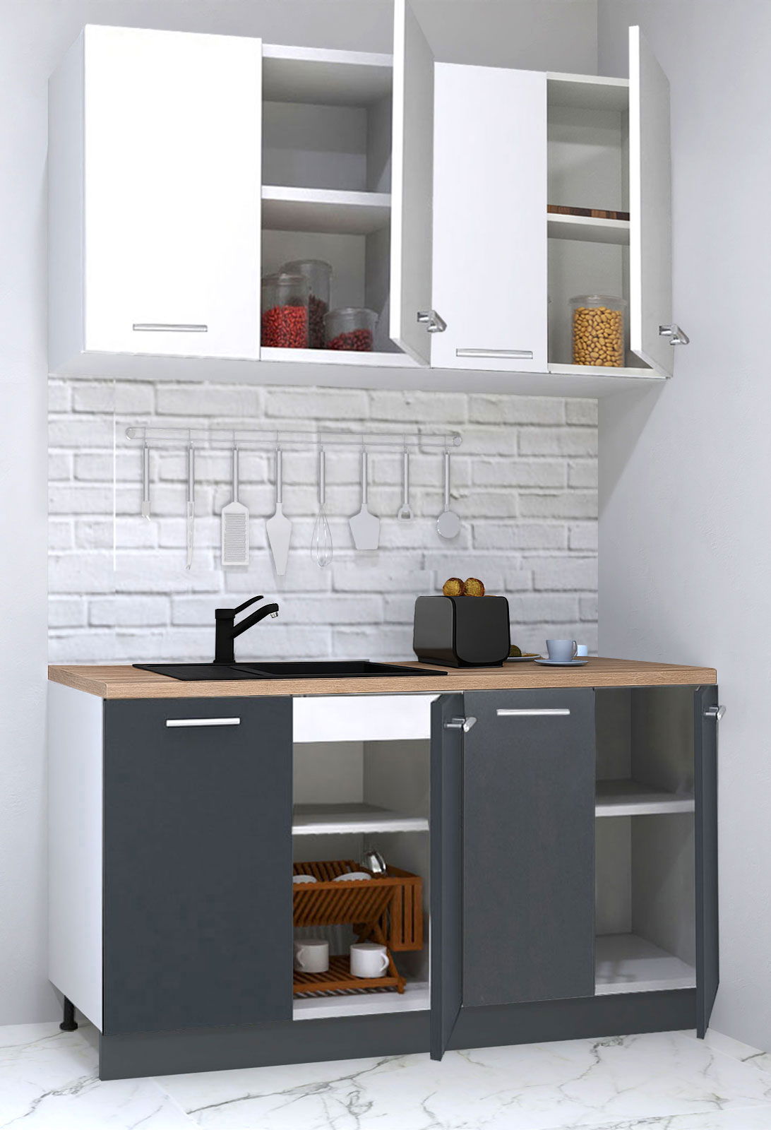 Dimensiuni: adancimea dulapurilor inferioare - 50 cm, iar a celor suspendate - 32 cm