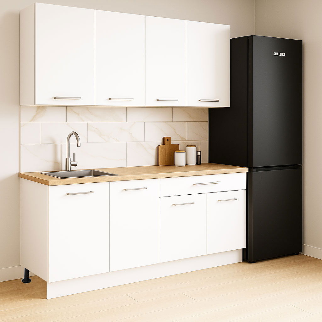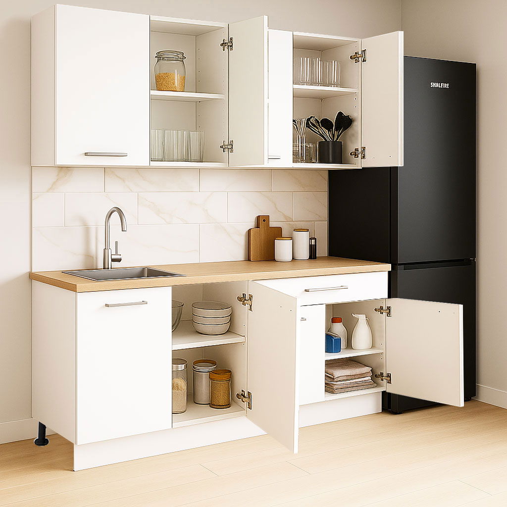 Excluderi: setul nu include chiuveta, bateria, aragazul, hota sau alte obiecte decorative prezentate in imagini