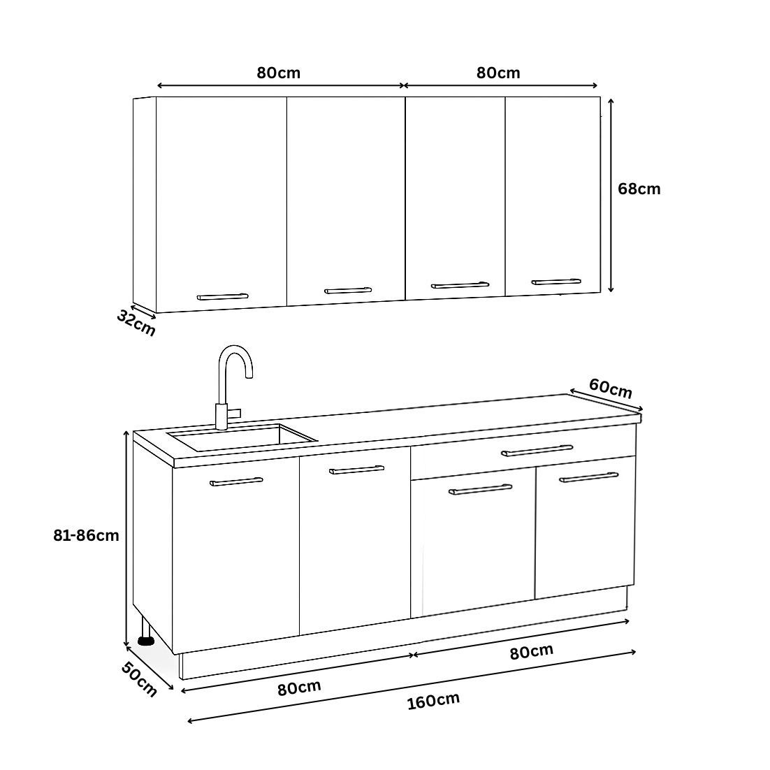 Dimensiuni: adancimea dulapurilor inferioare - 50 cm, iar a celor suspendate - 32 cm