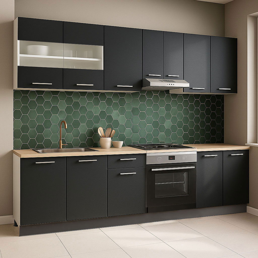 Excluderi: setul nu include chiuveta, bateria, aragazul, hota sau alte obiecte decorative prezentate in imagini