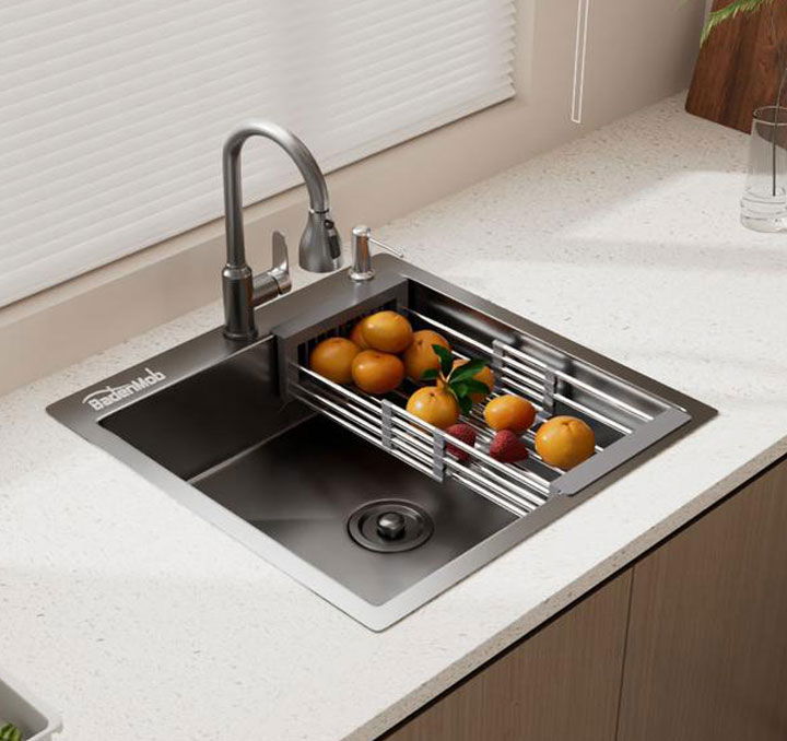 Setul de chiuvetă de bucătărie, realizat din inox de 3 mm, oferă rezistență și funcționalitate pentru utilizarea zilnică. Este echipat cu baterie extractibilă cu 3 funcții, coș pentru scurgerea vaselor și dozator pentru detergent, contribuind la un spațiu de lucru practic și bine organizat. Cu dimensiunile de 50 x 50 cm, este potrivit pentru bucătării în care se dorește utilizarea eficientă a spațiului.